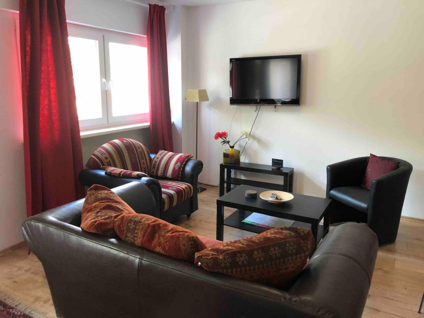 Standard Apartment. This apartment features 1 living room, 1 separate bedroom and 1 bathroom with a hairdryer. The apartments kitchen, which features a refrigerator and a microwave, is available for cooking and storing food. This apartment has a tea and coffee maker, heating and a flat-screen TV with cable channels. The unit has 3 beds.