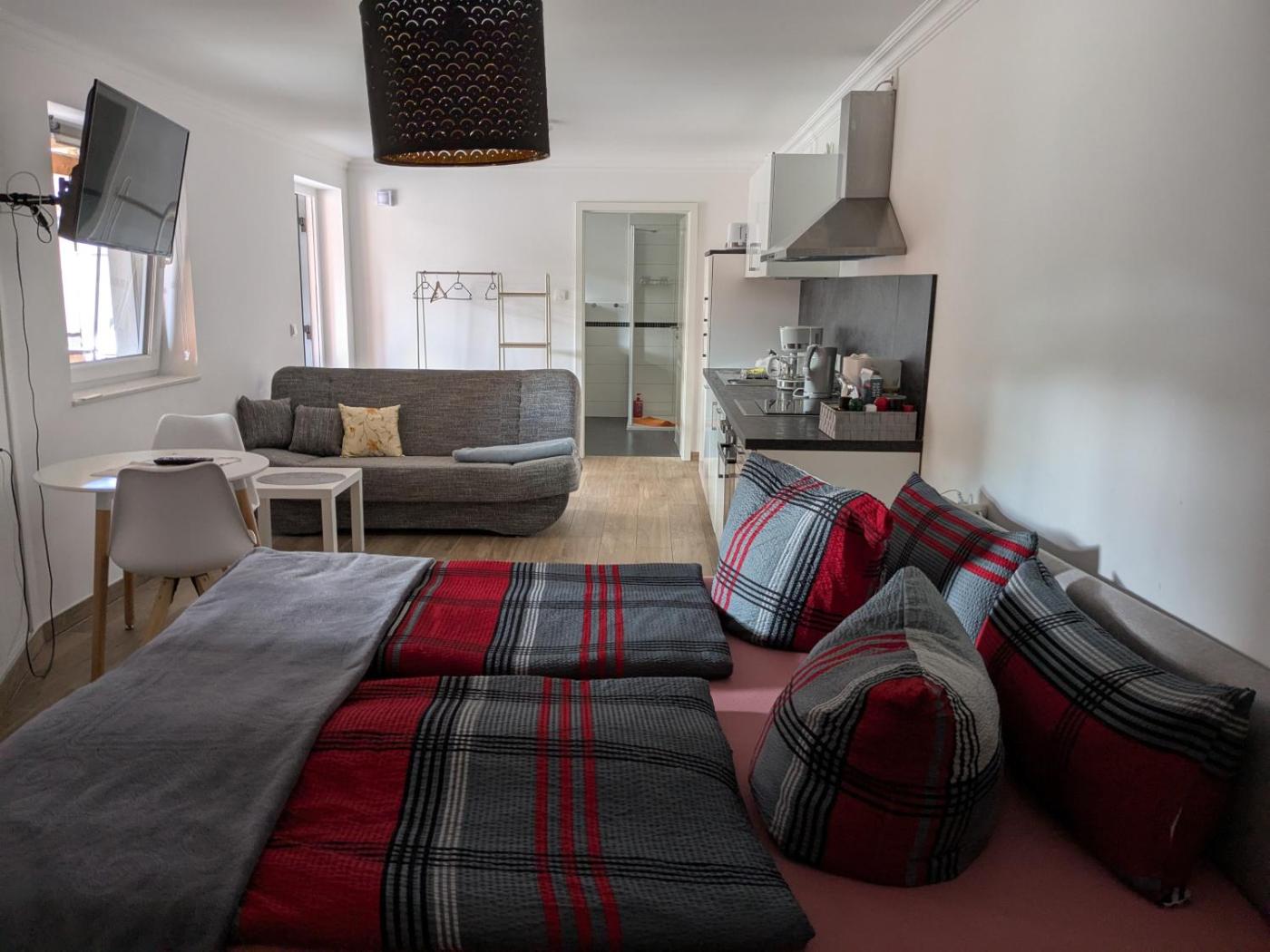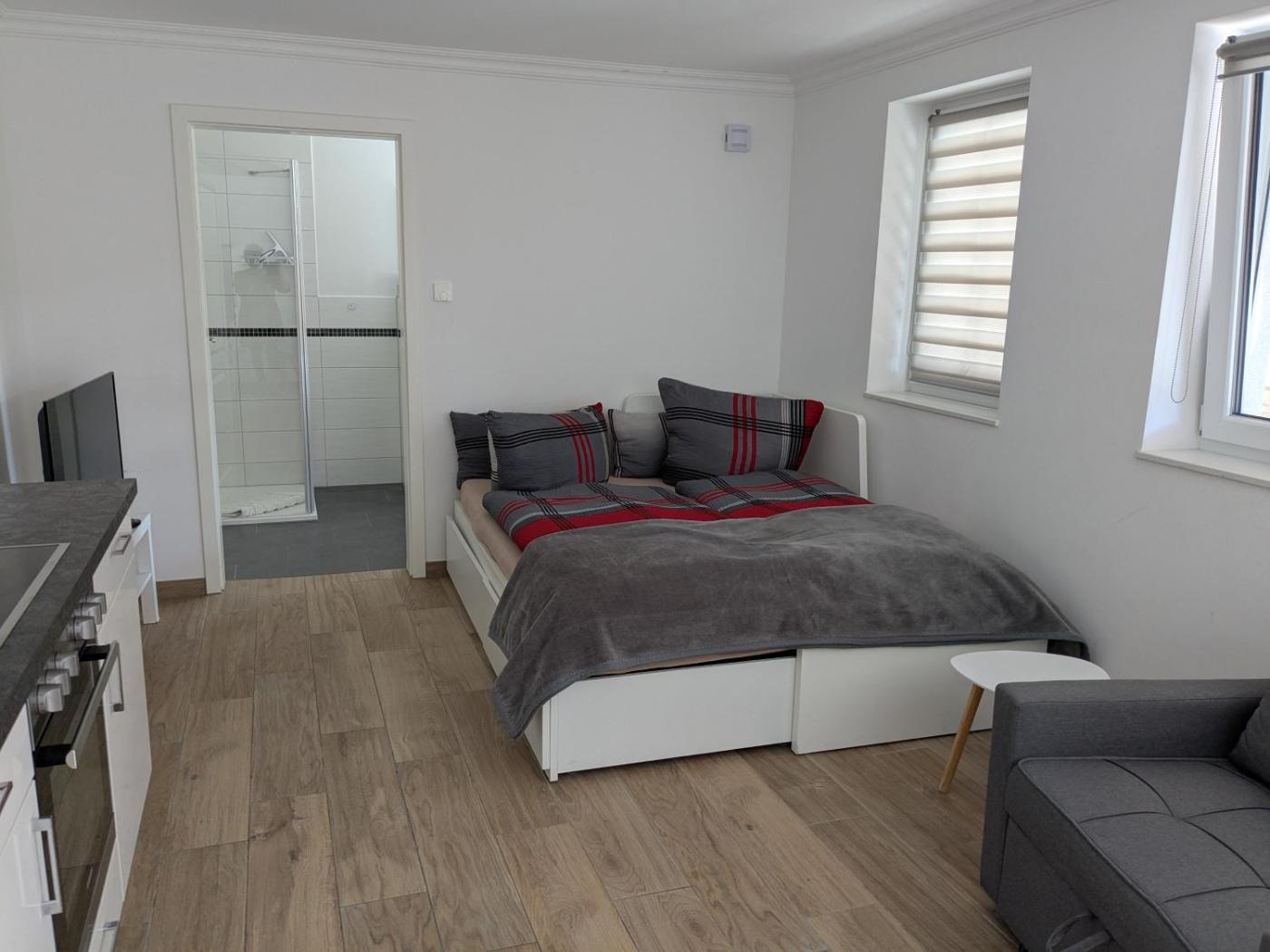Double Room with Private Bathroom. The spacious double room has a private bathroom, a private entrance, a tea and coffee maker, as well as a seating area with a flat-screen TV. Meals can be prepared in the kitchen, which has a stovetop, a refrigerator, kitchenware and an oven. The double room offers parquet floors, a tiled floor, heating, a TV, as well as ancourtyard view.