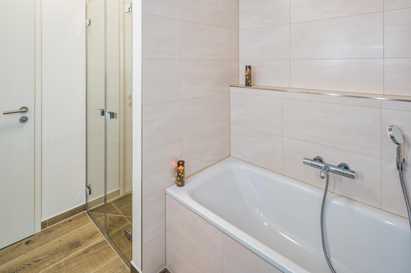 Three-Bedroom Apartment. This spacious apartment includes 1 living room, 3 separate bedrooms and 1 bathroom with a walk-in shower and free toiletries. Meals can be prepared in the kitchen, which is fitted with a stovetop, a refrigerator, a dishwasher and kitchenware. Boasting a terrace with garden views, this apartment also offers a private entrance and a flat-screen TV. The unit has 6 beds.