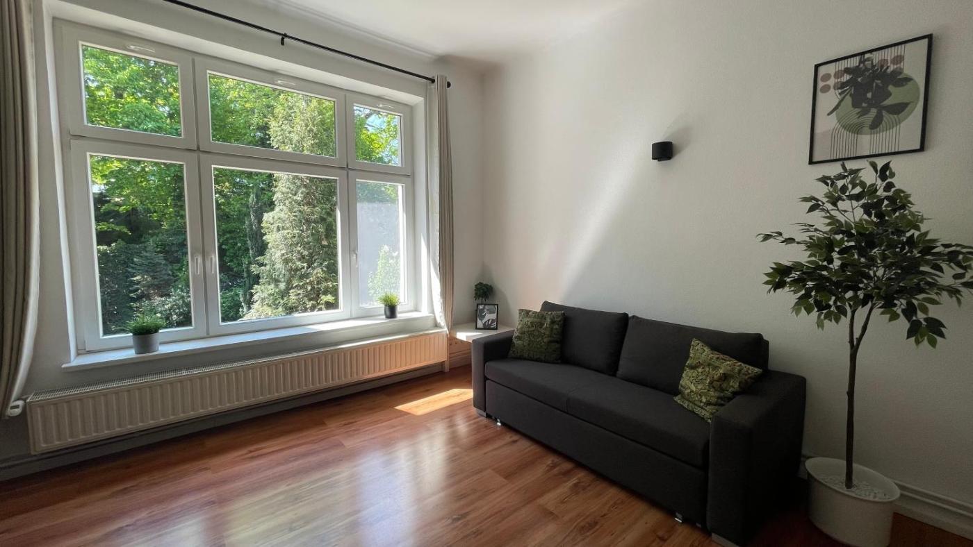 Apartment. This spacious apartment consists of 1 living room, 1 separate bedroom and 1 bathroom with a bath and a shower. Guests can make meals in the kitchen that is equipped with a stovetop, a refrigerator, kitchenware and an oven. The apartment features parquet floors, a seating area with a flat-screen TV, a coffee machine, a wardrobe as well as garden views. The unit offers 3 beds.