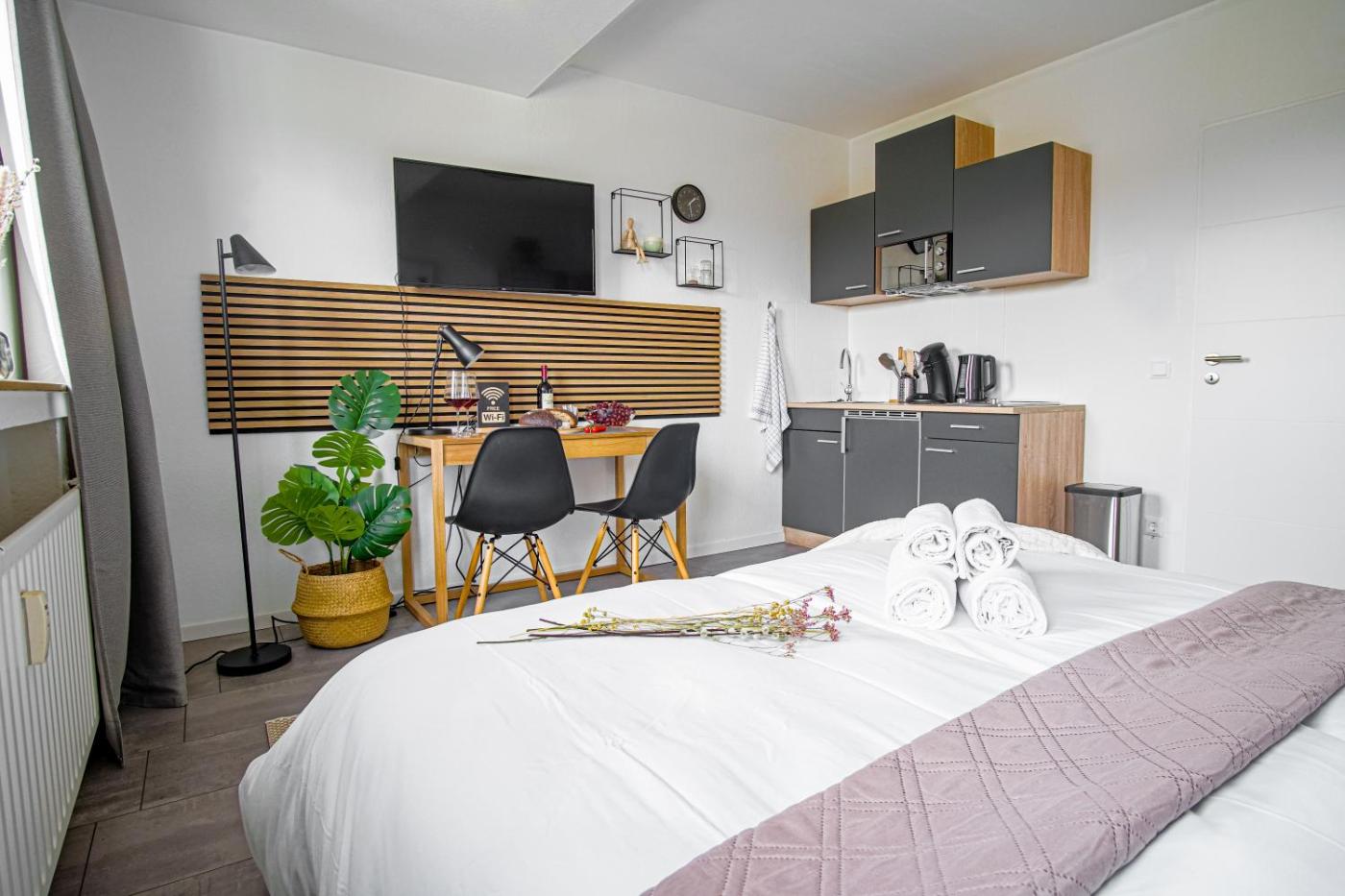 One-Bedroom Apartment. The apartment has 1 bedroom and 1 bathroom with a shower and free toiletries. Meals can be prepared in the well-fitted kitchen, which has a refrigerator, kitchenware, a microwave and a toaster. The apartment features a tea and coffee maker, a dining area, heating, a flat-screen TV with streaming services, as well as garden views. The unit has 1 bed.