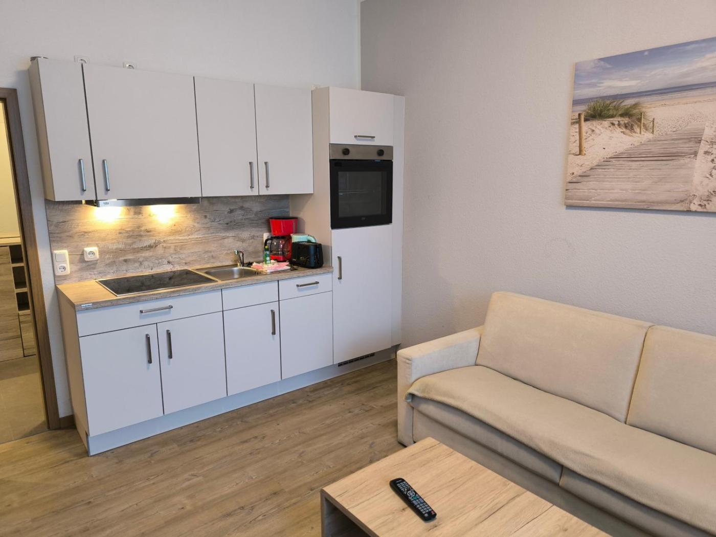 Apartment - Ground Floor. This apartment comprises a kitchen, a seating area, 1 separate bedroom and 1 bathroom with a shower. Guests can make meals in the kitchen that comes with a stovetop, a refrigerator, a dishwasher and kitchenware. The apartment provides a coffee machine, a wardrobe, heating and a TV with cable channels. The unit offers 1 bed.