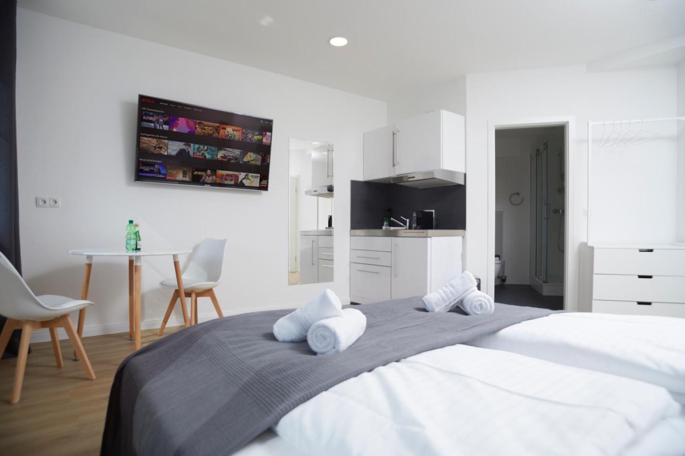 Apartment 3 with King Bed. Providing free toiletries, this studio includes a private bathroom with a shower and a hairdryer. In the well-fitted kitchenette, guests will find a stovetop, a refrigerator, a dishwasher and kitchenware. This studio features a washing machine, soundproof walls, flat-screen TV with streaming services, as well as winechampagne for guests. The unit offers 2 beds. ;