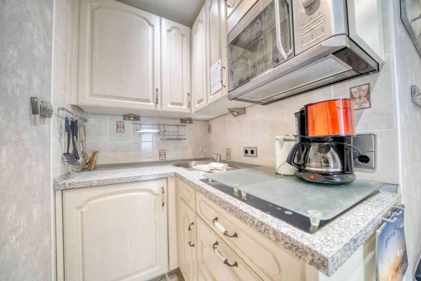 The apartment is composed of 2 separate bedrooms, a fully equipped kitchenette with a microwave and a toaster, and 1 bathroom. A TV is featured.
