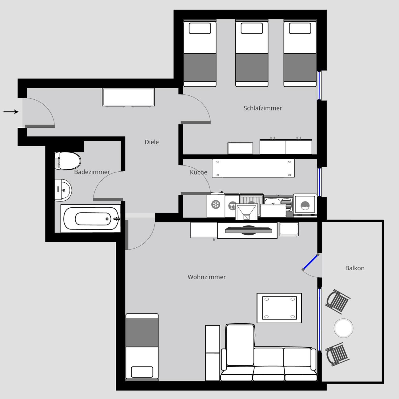 Three-Bedroom Apartment. Boasting a private entrance, this spacious apartment also includes 3 separate bedrooms, 1 bathroom with a shower, a kitchen and a dining area. In the well-fitted kitchen, guests will find a stovetop, a refrigerator, a dishwasher and kitchenware. This apartment has a washing machine, a tea and coffee maker, a flat-screen TV with streaming services and a balcony. The unit has 6 beds. ;