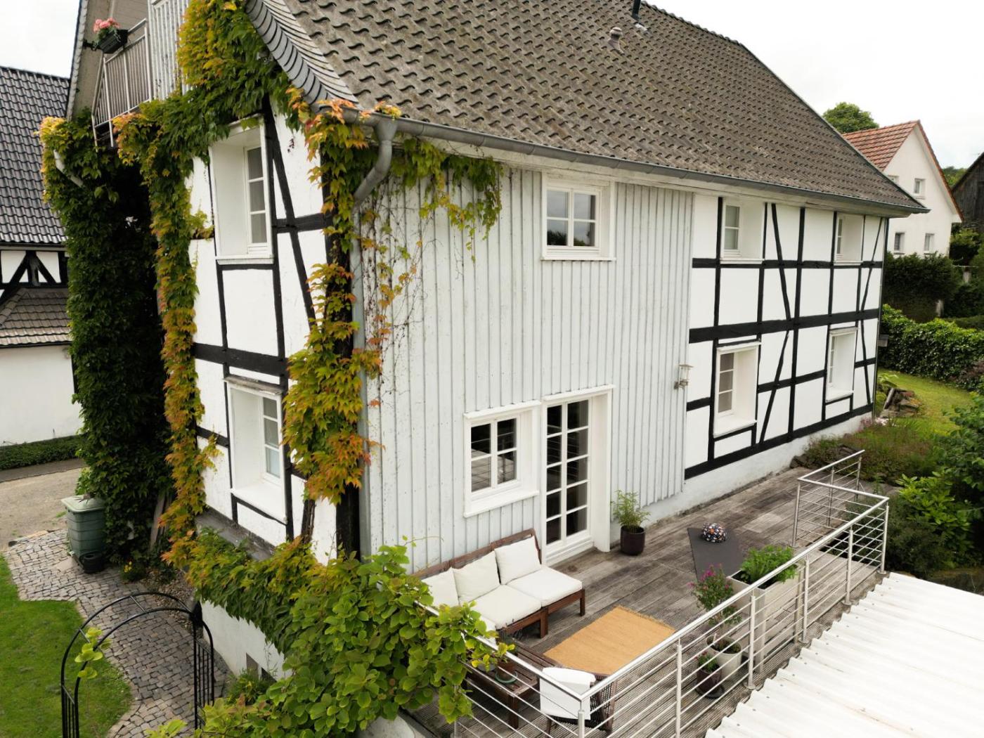 Situated in Nümbrecht in the North Rhine-Westphalia region, Auszeit & Natur - ländliche Fachwerkhaushälfte has a balcony and garden views. There is a sun terrace and guests can make use of free WiFi, free private parking and an electric vehicle charging station.