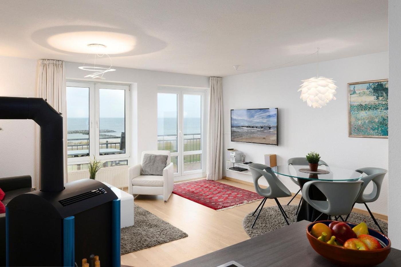The spacious apartment with a balcony and sea views has 1 bedroom, a living room, a TV, an equipped kitchen with a dishwasher and an oven, and 1 bathroom with a shower. There is also a seating area and a fireplace.