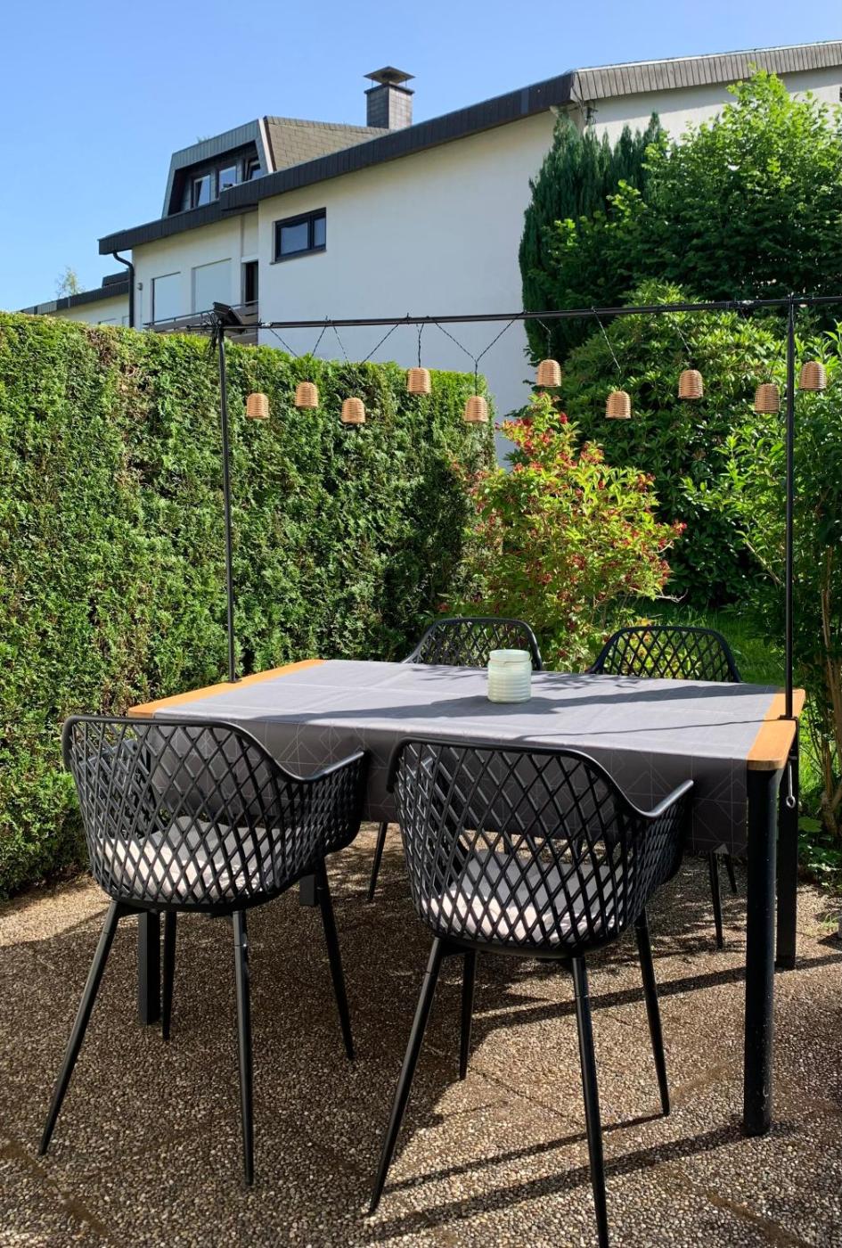 The apartment is equipped with 1 bedroom, 1 bathroom, bed linen, towels, a flat-screen TV, a fully equipped kitchen, and a terrace with garden views. The property has an outdoor dining area.