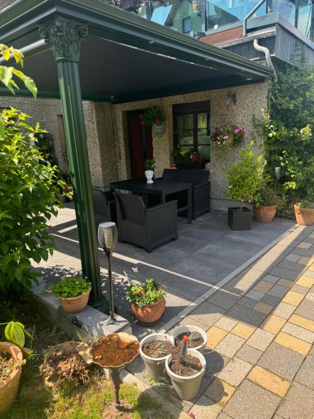 The apartment has 1 bedroom, 1 bathroom, bed linen, towels, a flat-screen TV with satellite channels, a dining area, a fully equipped kitchenette, and a terrace with garden views. The property has an outdoor dining area.
