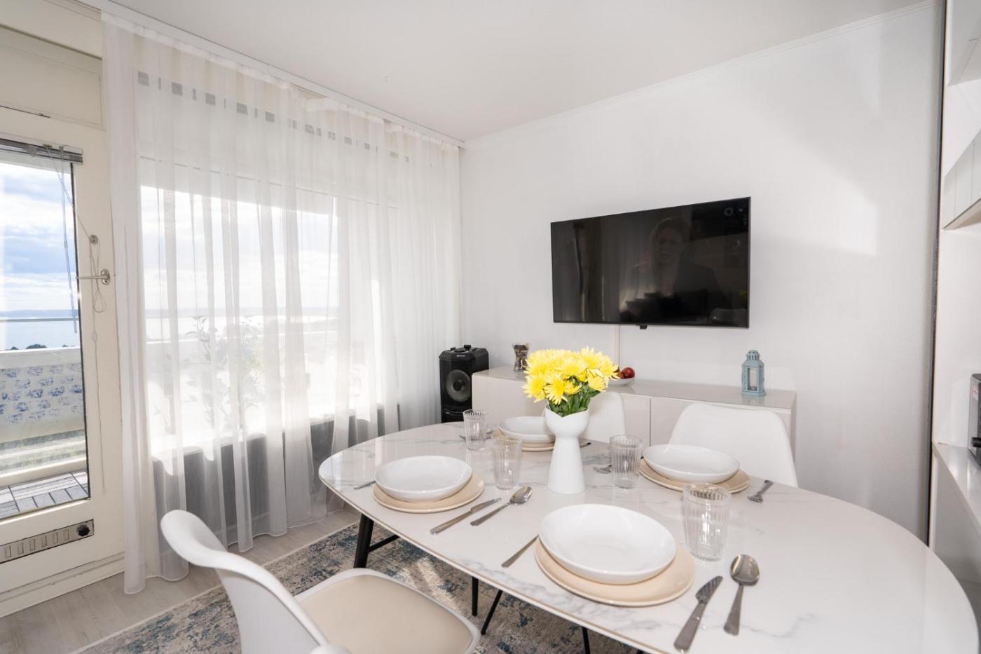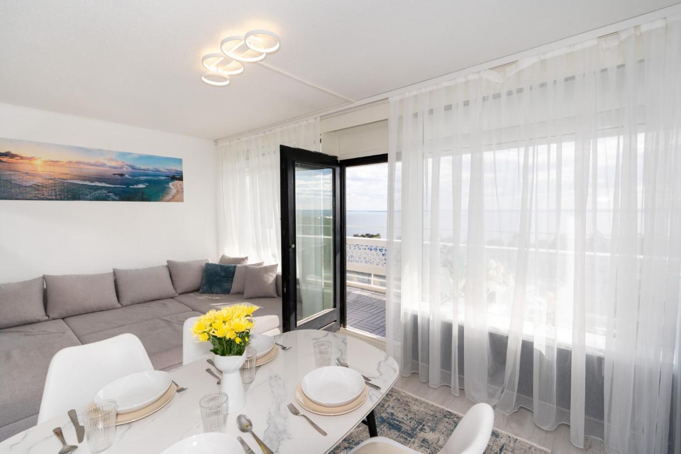 Apartment with Sea View. This apartment comes with 1 living room, 1 separate bedroom and 1 bathroom with a shower. Guests can make meals in the kitchen that features a stovetop, a refrigerator, kitchenware and a microwave. Boasting a balcony with sea views, this apartment also features a coffee machine and a TV. The unit has 2 beds.