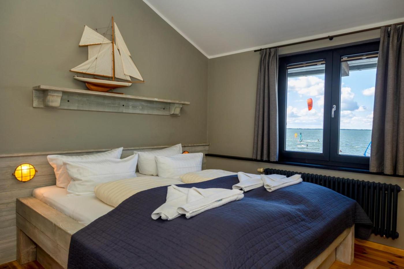 The rooms and apartments at Pension Café Knatter are decorated on a seaside theme.rooms feature a view of the Achterwasser Lake.