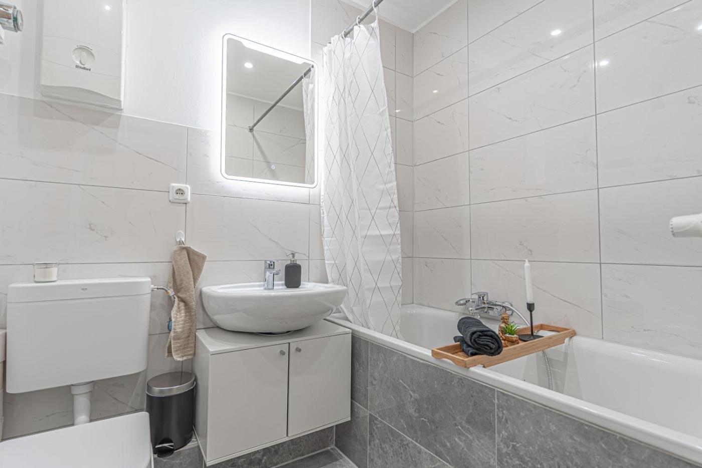 One-Bedroom Apartment. This apartment comes with 1 living room, 1 separate bedroom and 1 bathroom with a bath and a hairdryer. In the well-fitted kitchen, guests will find a stovetop, a refrigerator, kitchenware and an oven. This apartment has a tea and coffee maker, heating, a flat-screen TV with streaming services and a balcony. The unit has 2 beds.