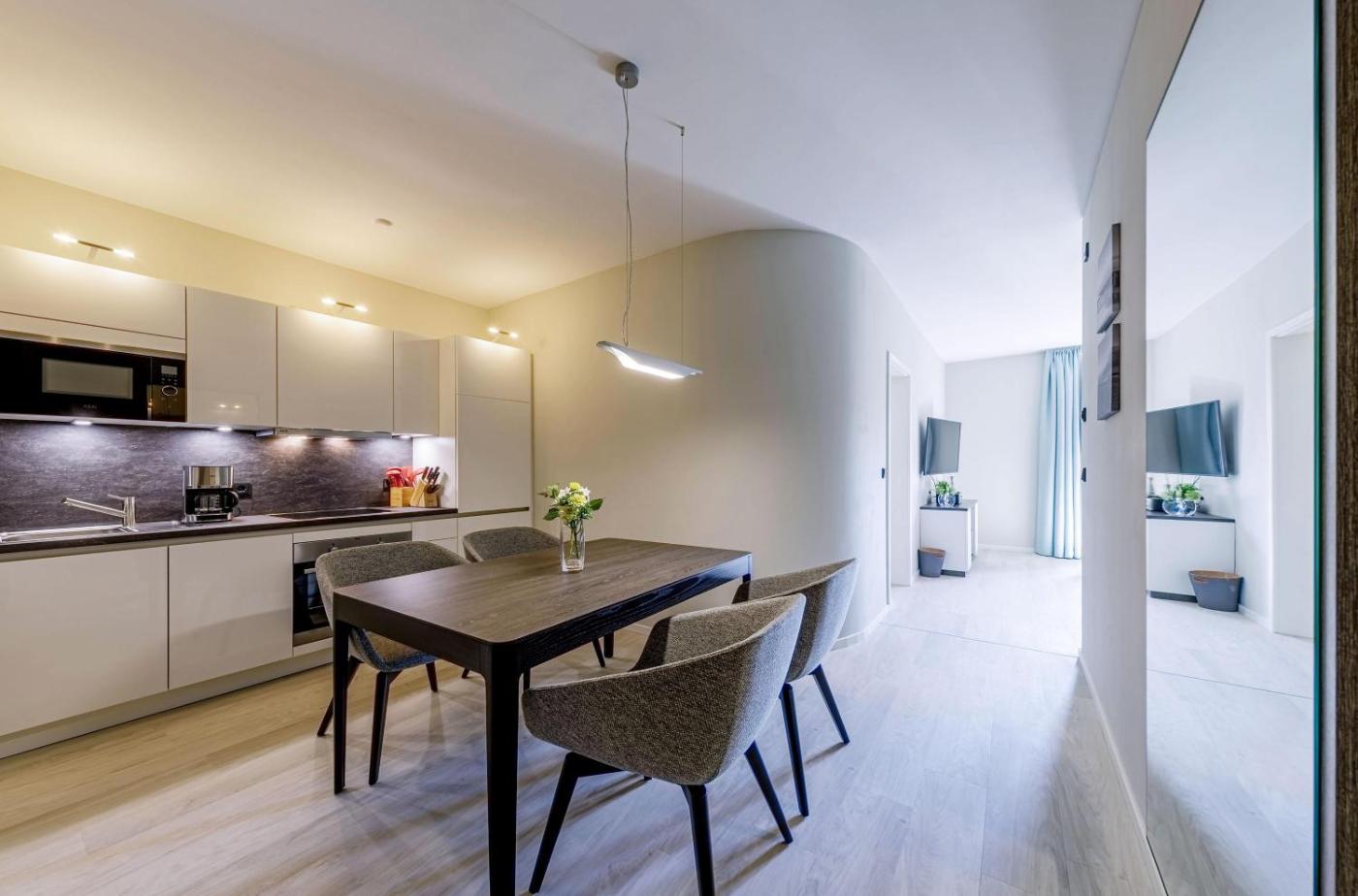 Apartment with Balcony. This apartment offers a sauna. This spacious apartment comprises 1 living room, 2 separate bedrooms and 2 bathrooms with a shower and a hairdryer. Meals can be prepared in the well-fitted kitchen, which comes with a stovetop, a refrigerator, a dishwasher and kitchenware. Featuring a balcony, this apartment also provides a washing machine, a coffee machine and a TV. The unit offers 3 beds.